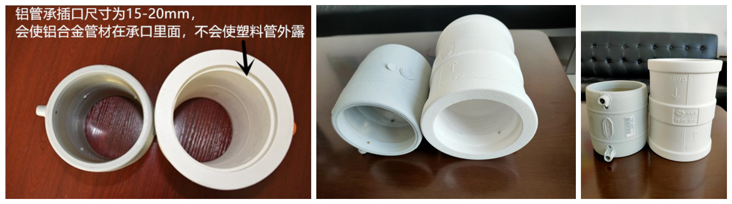 2)管件S2.5系列產(chǎn)品、承壓為2.5Mpa,管件兩端口部承口尺寸為15-20mm,永遠會使鋁合金管材在承口里面,不會使塑料管外
