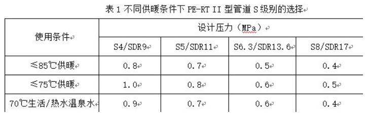 由以上表可以看出,PE-RT II型管道一般選用S5系列即可滿足小區(qū)集中供暖管網(wǎng)的運(yùn)行溫度、1、壓力要求