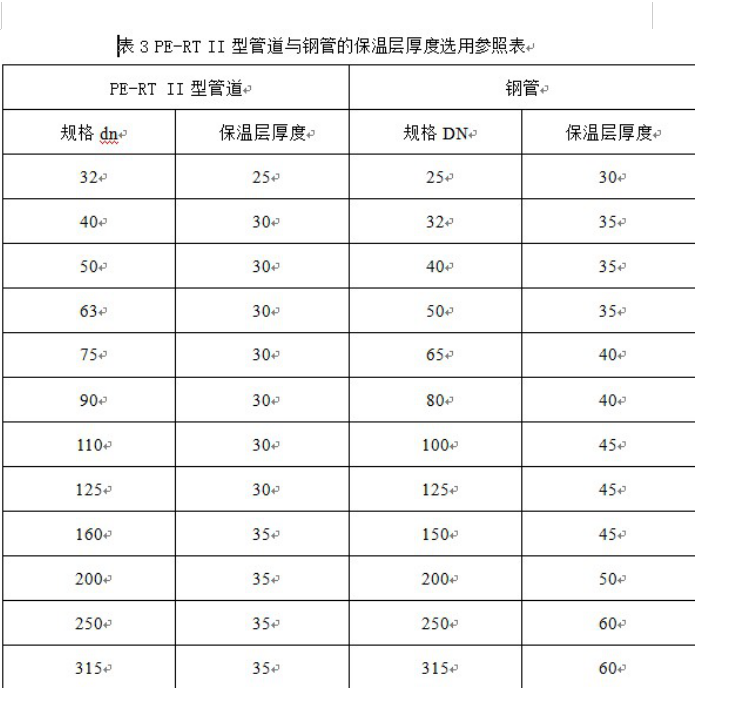 PE-RT II型供熱管道與鋼管相同,都采用工作管、保溫層、外護(hù)管三位一體的保溫結(jié)構(gòu),由于PE-RT II型材料的導(dǎo)熱系數(shù)為鋼管的1%,即管材本身具有較好的保溫性能,且PE-RT II型管道、保溫層、外護(hù)管的熱膨脹系數(shù)基本一致,會(huì)成為一個(gè)整體,不易分層、脫落,管道保溫效果優(yōu)于鋼管,在相同的外界溫度條件下,更節(jié)約保溫材料。以輸送80℃熱水為例,相同流量的外界溫度下,PE-RT II型管道與鋼管的保溫層厚度選型見表3
