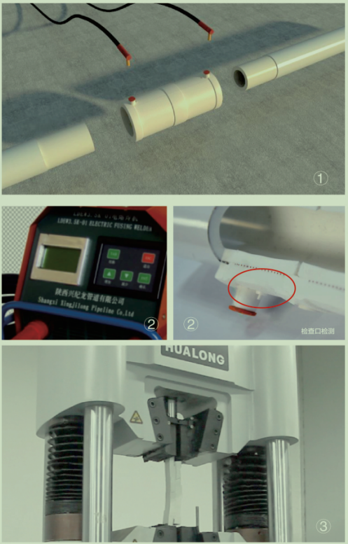 電熔焊接口連接強(qiáng)度高,zui大拉伸力20000N,接口處強(qiáng)度是管材本身的2倍。(圖③)